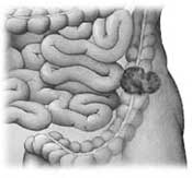 De dikke darm, met daarin weergegeven de ontwikkeling van een tumor.