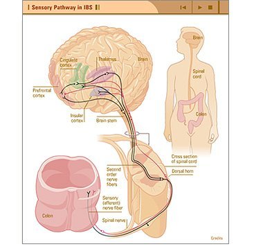 Mayer en zijn team hebben bij IBS-patiënten de dikke darm gepikkeld. Daarbij werd een kunststof ballon ingebracht en zover opgeblazen tot de personen de eerste tekenen van pijn ondervonden. Tegelijkertijd werd de hersenactiviteit tomografisch in beeld gebracht. Alle patiënten met een ‘spastische darm’ vertoonden in vergelijk tot gezonde mensen bij het optreden van onaangename gevoelens onder andere een verhoogde activiteit in de regio van het limbische systeem (belangrijk voor de verwerking van gevoelens): ‘het gebied van het onwel-zijn’. Dit gebied werd met de verwerking van negatieve lichaamsimpulsen in verband gebracht – zij bestuurt een mechanisme, dat onaangename gevoelens moet onderdrukken. ‘Zoals het fenomeen van een kietelende trui’ verklaart Mayer. ‘Na verloop van tijd merkt men niets meer’. Bij gezonde mensen moeten daarom bijzondere prikkels uit de darmen een hoge drempel overschrijden voordat zij bewust worden. De ‘input is gedempt’.