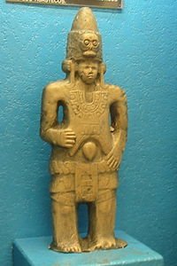 Beeld van EI Naranjo, Centraal Veracruz, met het hart op de plaats van de navel, de mythische plaats voor zowel het centrum van de wereld als de kiem van het menselijk leven. Musea Nacional de Antropologia, Mexico.